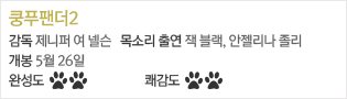 고양이 기지개: 새로운 악당 셴이 출연하면서 팬더 포의 숨겨진 과거가 밝혀진다. 하긴 거위가 팬더의 아버지라는 건 말이 안 된다. 포가 늑대들과 싸우는 장면은 다분히 <인디아나 존스> 시리즈의 추격 신을 차용했고, 태극권으로 포탄을 막아내는 포의 당당함은 어딘가 이연걸을 떠올리게 만든다. "나는 누구일까?" 궁금해 하는 포는 결국 자신의 정체성을 되찾고, '내면의 평화'로 강적 셴을 물리친다. 기본 플롯이나 아이템은 성룡의 쿵푸 영화에서 보던 것들이다. 어린 포도 <슈렉>의 장화신은 고양이처럼 귀염둥이 깜짝 포스를 발휘한다면 믿을려나? 괜찮은 속편이다!