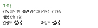 고양이 기지개: 또 엄마다! 단어만 들어도 눈물이 난다는 존재. 구성주의 <엄마>는 고두심, 하명중의 <어머니는 죽지 않는다>는 한혜숙, 유성엽의 <친정엄마>는 김해숙을 엄마로 내세웠다. 그리고 이번에는 <마마>다. 김해숙, 전수경, 엄정화가 엄마로 나온다. 일단 눈물 바다를 만드는 영화라 예상하기 쉽지만, 눈물의 강도나 짠맛은 그리 강하지 않다. 기껏해야 한두 번 글썽거리게 만든다. 그보다는 3인3색의 드라마로 승부를 한다. 여전히 김해숙의 '엄마' 연기 만큼은 최고다. 그런데 아직도 이런 방식이 먹히나?