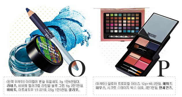 눈가에 포인트를 주고 싶다면 망설일 것 없이 푸른색 아이템을 선택하자. 올여름에는 바닷빛을 연상시키는 다양한 톤의 블루 컬러 아이섀도가 출시되었는데, 진한 색깔로 골라 속눈썹 라인에 얇게 칠하거나 파스텔 컬러와 블렌딩하는 방법이 제격이다. 또는 블루 아이라이너나 블루 마스카라 등을 활용해보는 것도 좋을 듯. 이때 입술색은 누드 계열의 깨끗하고 은은한 색깔들이 적당하다. |