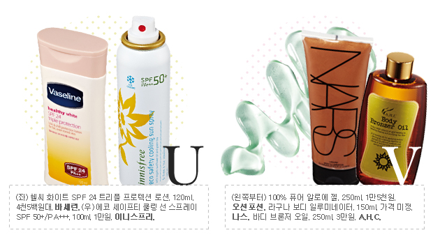 먼저 야외에서 태닝을 할 때는 피부 손상을 줄이면서 골고루 태울 수 있게 도와주는 오일 또는 로션을 사용하고, 자극으로 인한 노화와 탄력 저하를 막아줄 수 있는 비포&애프터 케어가 필수다. 태닝 효과를 높이기 위해서는 1~2일 전에 각질 제거를 위한 스크럽 제품의 사용도 잊지 말자.