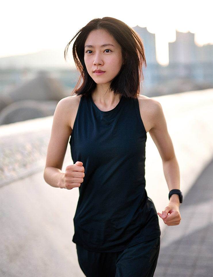 “새벽에 일찍 눈뜨면 아무 생각 없이 운동복을 챙겨 입고 나가요. 그러면 깜깜할 때 달리기를 시작해서 해 뜰 때 돌아와요. 오늘 하루 동안 무슨 일을 할지 생각하며 오롯이 나를 위한 시간을 보내는 거예요. 그러니 아무도 없는 새벽에 혼자 달리는 건 명상의 시간이죠. 달리다 중간에 탄천교에 도착하면 해가 뜨는 걸 볼 수 있는데 그 시간이 참 좋아요. 오늘 하루도 내 의지로, 스스로의 힘으로 시작한다고 느껴요.”