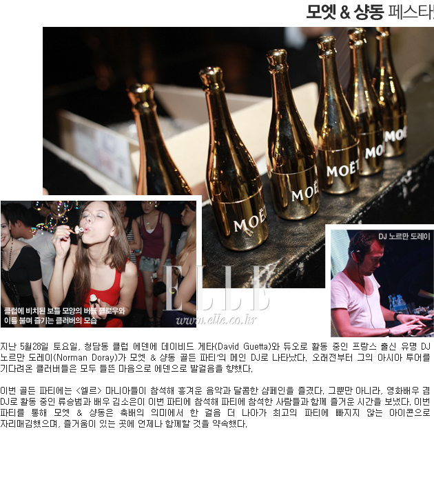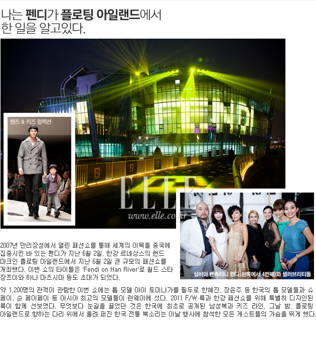 Elle.co.kr이 포착한 최근 가장 핫 한 행사가 열렸던 패션 현장 보고! 펜디는 한강의 플로팅 아일랜드에서 쇼를 열었고, 월드 스타 장쯔이가 모습을 드러냈다. 모엣&샹동은 클럽 에덴에 유명 DJ 노르만 도레이를 초청해 최고의 음악과 샴페인으로 뜨거운 밤을 보냈다. 178년 전통의 스위스 와치 메이커 예거 르쿨트르는 2011년 새로 출시된 타임피스를 소개하는 뜻깊은 밤을 가졌다.