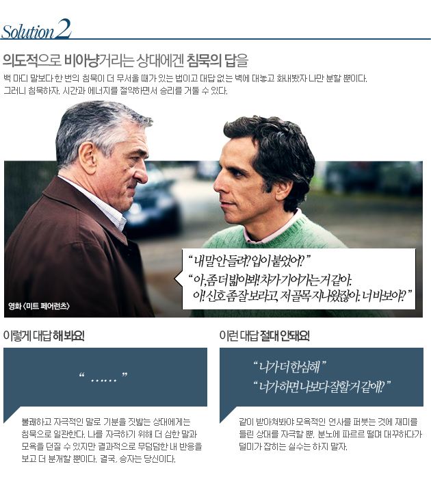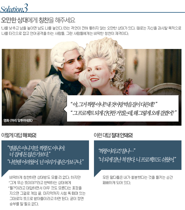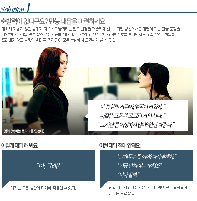 잘 벼린 칼날처럼 날카롭게 가슴을 파고드는 독설에 상처받지 않고 강해지고 싶은가? 대화가 끝난 다음 “아! 그때 이렇게 말해주는 건데!”라고 뒤늦게 후회해봐야 소용 없다. 적절한 타이밍에 재치있게 받아치는 것만이 해답이다. 독설을 받아치는 현명한 대화 호신술, Elle.co.kr에서 배워보자.