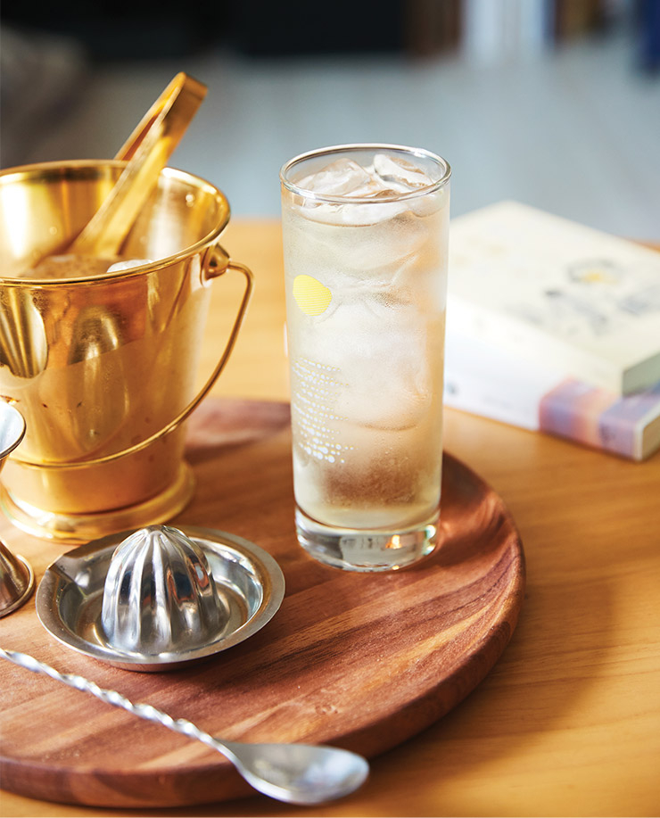 가구 공방 ‘공공 워크룸’에서 주문 제작한 수납장과 책 선반은 없으면 안 된다. 술과 함께 책과 카세트테이프, LP 컬렉션까지 최대한 컴팩트하게 수납하도록 도와주니까. 이 외에도 <칵테일탐구생활>의 김호 작가가 만든 하이볼 잔, 스티키몬스터랩의 탁상 램프, 메모리레인의 캔들 워머 등 ‘홈술 생활’에 필요한 것들이 너무 많다.