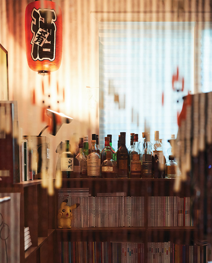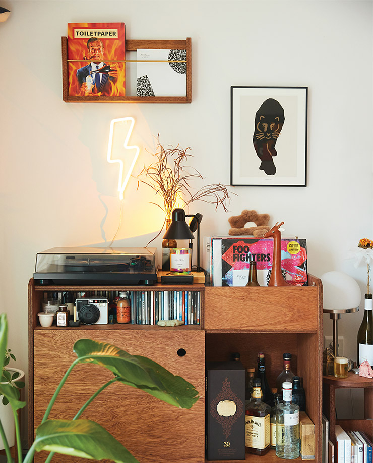 홈 바라기보다 술이 집 안 곳곳에 자연스럽게 스며든 형태에 가깝다. 손 닿는 곳에는 항상 술병이 있는데 빈 술병 하나도 버리지 못하고 화병으로 쓰는 맥시멀리스트 성향 때문이기도. 그 결과 새 술병과 텅 빈 술병, 책과 음반, 귀여운 소품들이 한데 모여 취향의 집합체 같은 거대한 홈 바가 탄생했다.