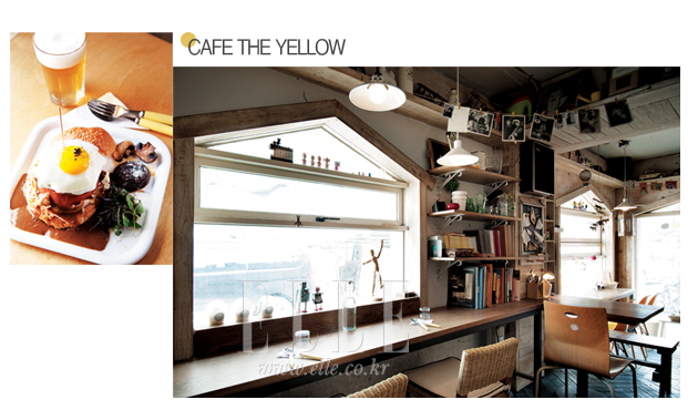 달걀노른자를 뜻하는 ‘카페 더 옐로우’는 동네의 노른자가 되겠다는 주인의 야심 찬 포부가 깃든 이름이다. 처음 문을 열 때만 해도 한적한 동네였는데 이곳이 생기고부터 이름 덕이라도 보듯, 가게 주변으로 슬슬 새로운 건물들이 들어서고 있다. 두 건물 사이 벽을 터서 이어 만든 긴 통로 같은 구조가 흡사 기차 안을 연상케 한다. 실내 구석구석 아기자기한 소품들로 눈길 둘 곳이 많고, 합주실과 녹음실이 밀집한 동네 특성상 뮤지션 단골이 많다. 정성껏 만드는 가정식 스타일 파스타와 피자, 버거, 스테이크 등 다양한 메뉴를 선보이는데 유기농 밀빵에 두툼하게 썬 토마토와 수제 소고기, 애플브라운 소스가 어우러진 옐로 버거를 추천한다. 단호박을 통째로 쪄서 만든 수프, 버찌 향이 향긋한 일본 홍차, 핸드드립 커피를 꽁꽁 얼려 만든 이탈리아식 빙수 그라니타도 빠뜨리면 섭섭하다.