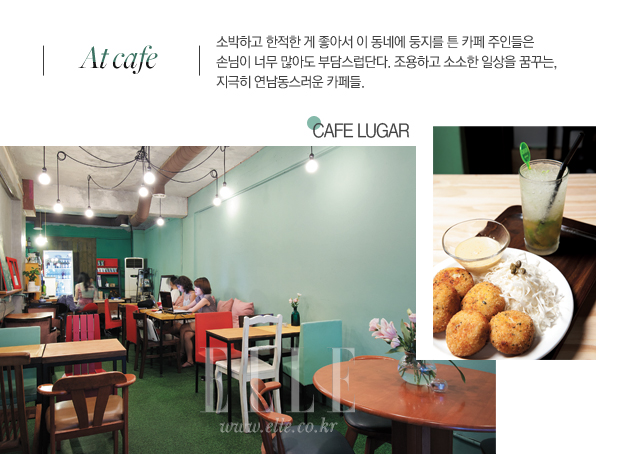 사진과 일러스트레이션을 중심으로 젊은 예술가들의 전시가 펼쳐지는 갤러리 카페 ‘루가르’. 지난 4월 리모델링을 마쳤는데, 각각 미술과 토목 엔지니어를 전공한 두 주인 아가씨가 시멘트를 바르고, 페인트를 칠하고, 가구를 조립하는 시공 작업까지 모두 직접 했다. 민트 빛 벽면에 톡톡 튀는 레드 컬러를 포인트로 준 공간은 기분을 한껏 들뜨게 한다. 알코올과는 거리가 멀 것 같은 예쁘장한 카페지만 모히토를 비롯한 여섯 가지 칵테일에 각종 병맥주, 위스키, 보드카 등 술 종류를 두루 갖추고 있으며, 실내 흡연도 가능하다. 블로그(cafelugar.tistory.com)에는 리모델링, 메뉴 업데이트 소식과 함께 주인장들의 재미있는 일상도 공개되어 손님들의 공감을 얻고 있다.