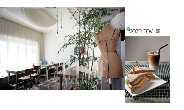 이 카페를 찾아가려면 스마트폰에 ‘연남 순대국’을 찍는 것이 가장 빠르다. 기사식당만 즐비한 이 거리에 작년 6월, 화이트 톤으로 환하게 빛나는 브런치 카페 ‘마젤토브 106’이 문을 열었다. 마젤토브는 히브리어로 ‘행운을 빈다’라는 뜻. 화이트 톤 고재와 가벼운 리넨으로 부드러운 분위기를 조성하고, 아트북과 사진으로 예술적인 느낌을 더한 인테리어가 멋스럽다. 인기 메뉴는 넉넉한 양과 맛을 자랑하는 브런치 메뉴와 샌드위치들. 시원한 생맥주까지 구비하고 있어 여름이면 맥주를 즐기는 손님들을 심심찮게 볼 수 있다. 정원처럼 꾸민 테라스와 노천 테이블에서 여유 있게 늘어지기 딱 좋은 한가로운 카페.
