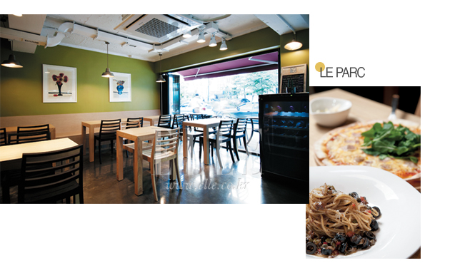 한적하고 조용한 연남동 골목 안쪽에 자리 잡은 이탤리언 비스트로 ‘르 파크’. 프랑스어로 ‘공원’이라는 의미란다. 올리브 그린 컬러로 꾸며진 실내가 녹음이 드리워진 여유로운 공원의 모습과 닮았다. 아직 오픈한 지 얼마 되지 않아 오가는 동네 주민들의 호기심과 주목을 한 몸에 받고 있는 연남동의 따끈따끈한 핫 플레이스. 파스타와 피자로 정리된 간결한 메뉴는 거품을 뺀 착한 가격을 자랑한다. 그리스 사람들이 즐겨 먹는다는 바삭한 그리스 피탄 도우에 베이컨과 소시지, 루콜라를 올린 피자와 앤초비 알리오올리오 파스타는 주인의 추천 메뉴. 인스턴트 스톡을 사용하지 않고 닭이나 소고기 육수를 끓여 만든 음식들은 이탈리아 음식 특유의 느끼하거나 짠맛이 없고 담백하다. 디저트로 퐁당 오 쇼콜라와 에스프레소 크림 브룰레도 준비되어 있다.