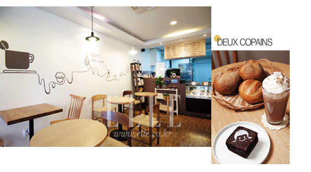두 친구라는 뜻의 ‘듀 꼬뱅’은 부부가 운영하는 베이커리 겸 카페다. 주변 대형 베이커리들을 물리치고 주민들의 사랑을 듬뿍 받고 있다. 15년 경력의 파티시에이기도 한 남편은 베이커리와 초콜릿 디저트 전문 숍의 부책임자를 지낸 베테랑. 남편은 빵을 굽고 아내는 커피를 내린다. 홀보다 주방이 더 넓은 이곳은 방부제나 첨가제를 사용하지 않은 홈메이드 스타일의 빵을 그날그날 조금씩 만들어 선보인다. 크랜베리가 씹히는 스콘, 다크 초콜릿 맛이 풍부하게 느껴지는 브라우니, 향긋한 유자 머핀, 아기 엉덩이 모양을 한 담백한 베이비 팡 등 재료 본연의 맛을 살린 빵들이 즐비하다. 초콜릿을 자유자재로 다루는 주인이 만든 케이크는 너무 예뻐서 먹기가 아까울 정도. 한쪽 벽면에 그려진 벽화는 손님이 직접 그려준 것이라고.