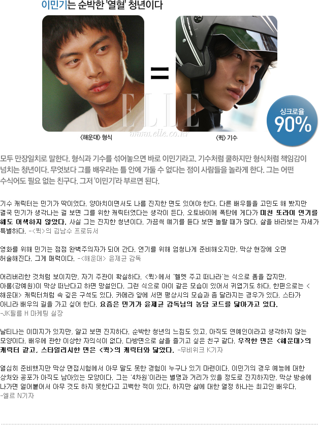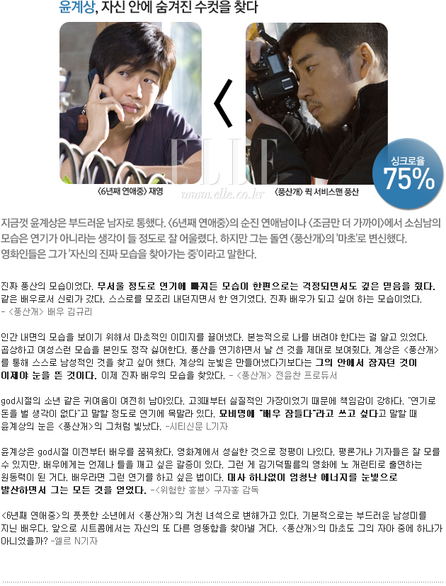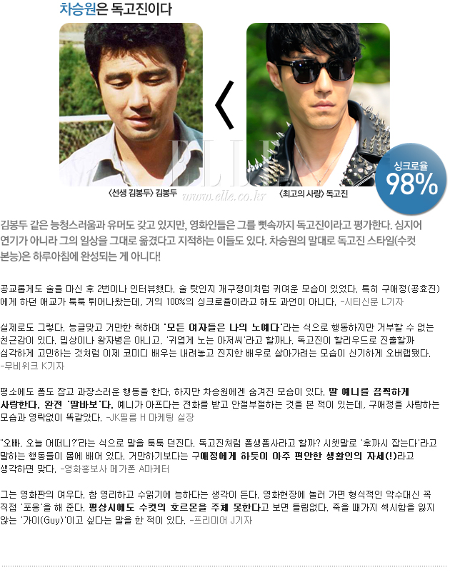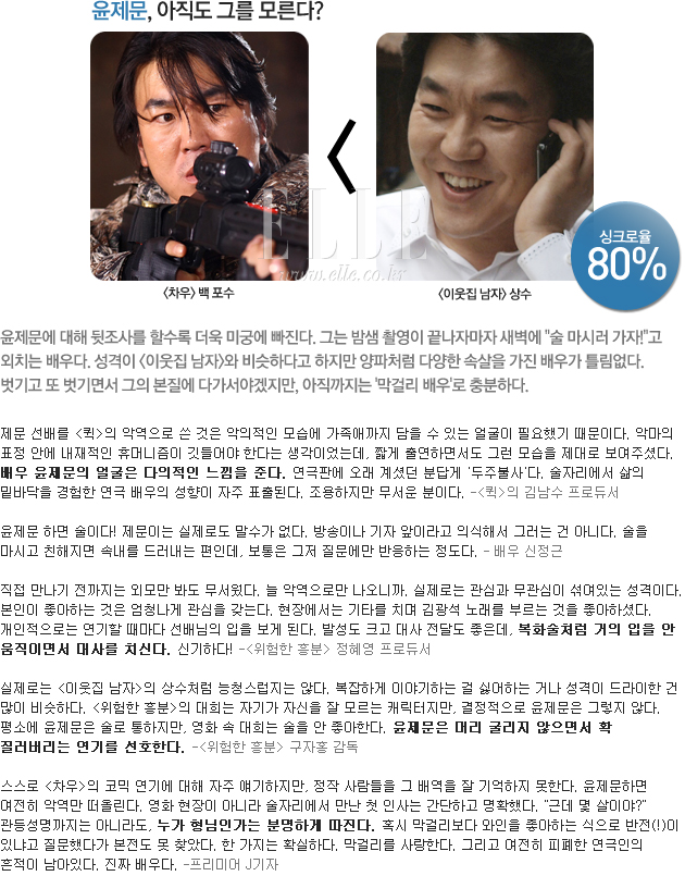 정말 연기 맞나? 어떤 스타의 연기를 보면 너무나 천연덕스러울 때가 있다. 다큐처럼 자연스러운 연기를 보면 그의 실제 모습이 어떨지 궁금증을 갖게 된다. 그래서 차승원, 윤계상, 이민기, 윤제문을 파고들었다. 그들의 인기 캐릭터와 실제 모습은 얼마나 닮았는지. 그 싱크로율을 영화인과 기자들에게 물었다. 과연 이들의 진짜 모습은?