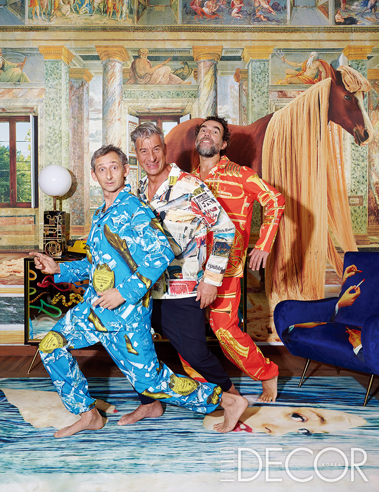 위트 넘치는 리빙 컬렉션 ‘토일렛 페이퍼 홈(Toilet Paper Home)’을 함께 전개하고 있는 <토일렛 페이퍼> 매거진의 공동편집장 피에르파올로 페라리와 마우리치오 카틀란, 이탈리아 리빙 브랜드 셀레티(Seletti)의 수장 스테파노 셀레티.