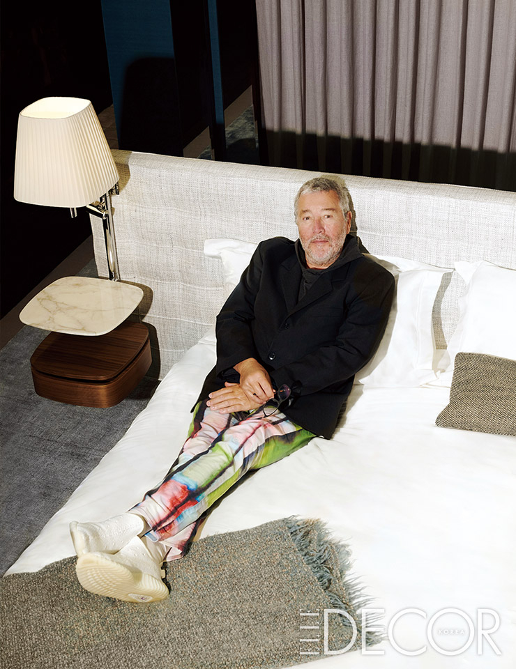카시나(Cassina)와 함께 디자인한 침대 컬렉션 ‘볼라지 EX-S 나이트(Volage EX-S Night)’에 앉아 있는 프랑스 산업디자이너 필립 스탁.