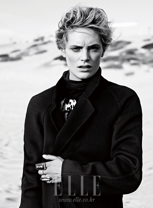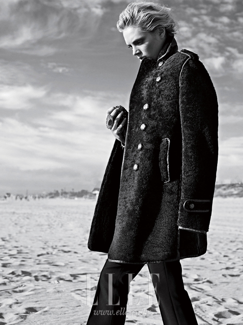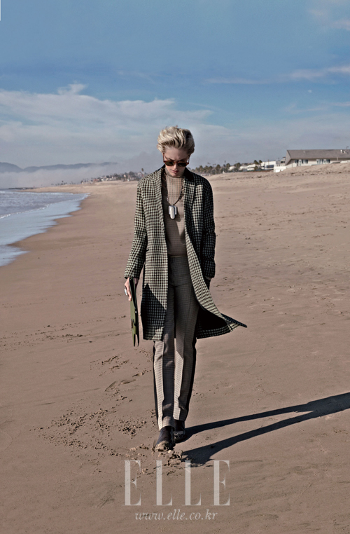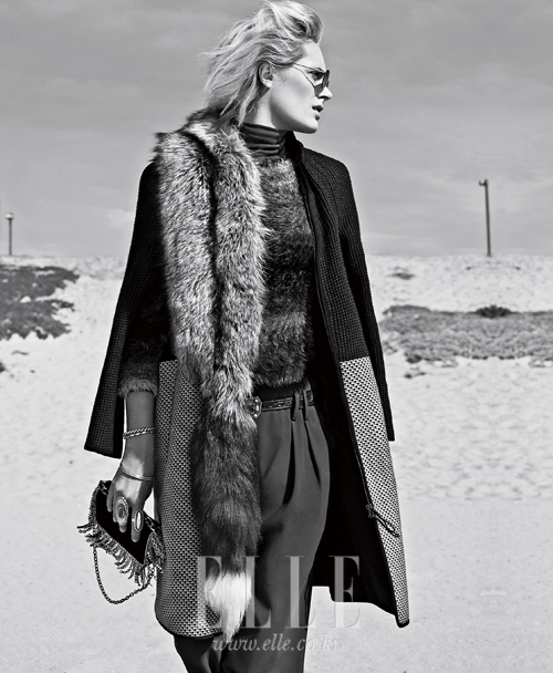 | 컬러가 배색된 울 코트는 3천2백75달러, 핀턱이 잡힌 울 팬츠는 1천1백25달러, 심플한 보잉 선글라스는 2백95달러, 모두 Giorgio Armnai. 니트 스웨터는 4백25달러, Emporio Armani. 코튼 소재의 터틀넥은 25달러, Uniqlo. 어깨에 걸친 퍼 스톨은 가격 미정, YSL. 두줄로 된 뱅글은 2백75달러, Miansai by Michael Saiger. 꼬임이 있는 뱅글은 각 75달러, 작은 실버 링은 1백75달러, 큰 실버 링은 2백40달러, 빈티지한 버클 벨트는 3백75달러, 모두 Vicki Turbeville. 체인 장식된 스웨이드 백은 1천1백75달러, Jimmy Choo. |