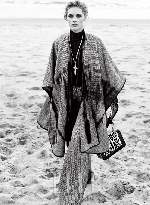 | 트위드 소재의 케이프는 2천5백95달러, 팬츠는 8백90달러, 모두 Emilio Pucci. 코튼 터틀넥은 60달러, Velvet by Graham & Spencer. 실버 링은 1백20달러, 터쿠아즈로 세팅된 십자가 네크리스는 4백75달러, 모두 Vicki Turbeville. 꼬임 장식의 실버 링은 35달러, Pandora. 투 톤 컬러 링은 2백90달러, Pamela Love. 컷아웃된 실버 링은 75달러, Jennifer Medina for Vicki Turbeville. 송치 소재 숄더백은 1천6백95달러, Jimmy Choo. |