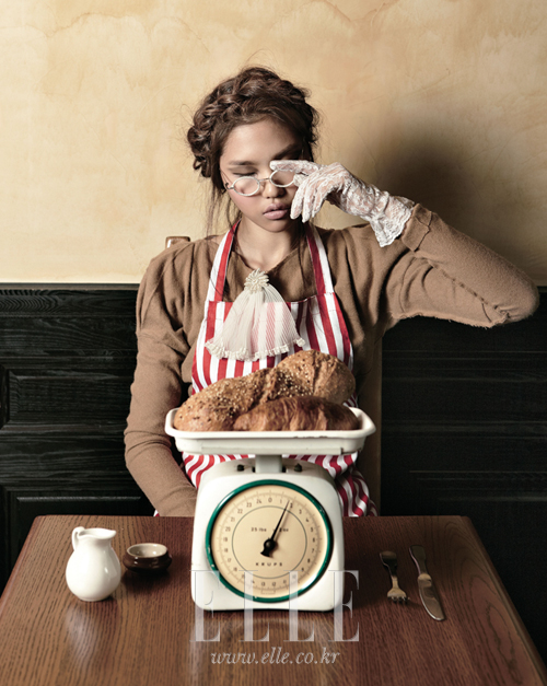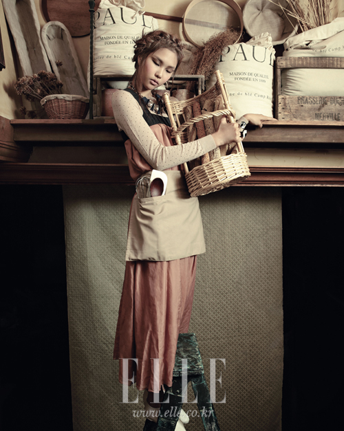 | 캐멀 컬러 맥시드레스. 가격 미정. 제인송. 스트라이프 패턴 앞치마. 1만8천원. 하드 워킹. 레이스 글러브. 화이트 프레임 안경. 네크라인에 꽂은 레이스 장식. 모두 가격 미정. 모두 벨 앤 누보. |