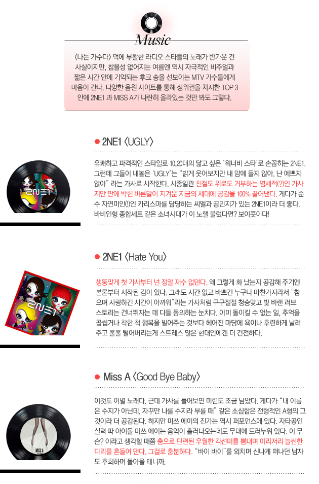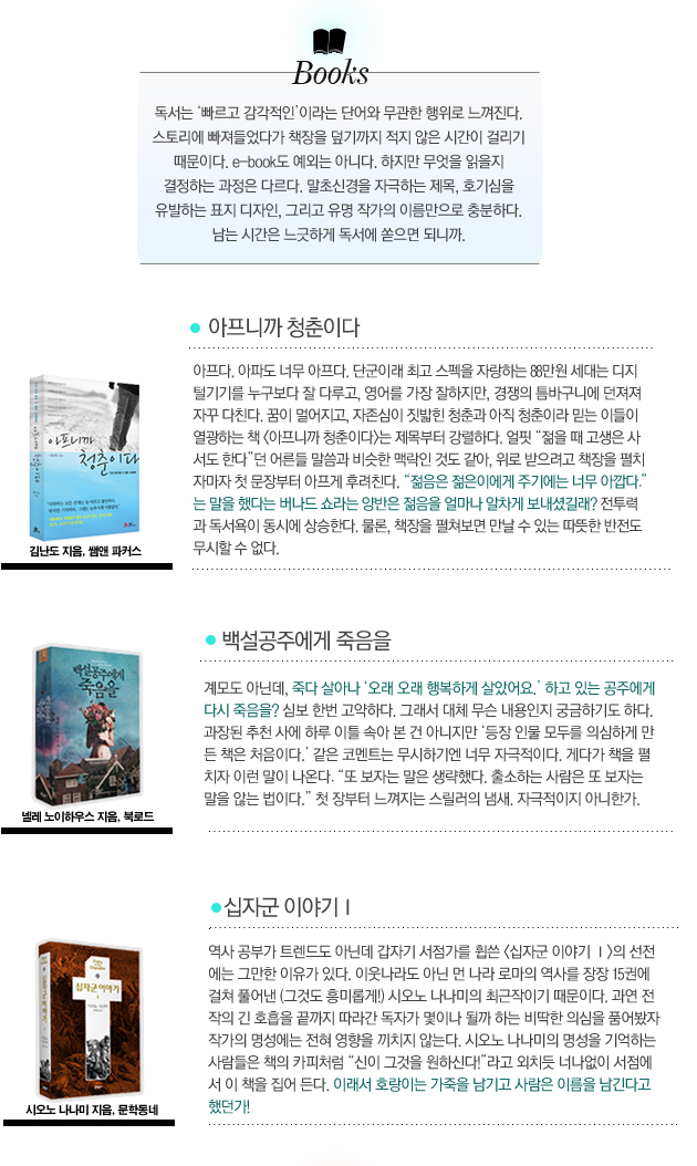 천하무적 이효리도 남자를 유혹하기 위해 ’10 minutes’나 걸리는데 1분 안에 사람들의 마음을 사로잡는 것은 물론, 지갑까지 열어 버리는 유혹의 대가들이 있다. 정보는 물론이고 컨텐츠의 홍수인 시대. 넘쳐나는 문화 아이템 속에서 치열한 경쟁을 물리치고 현재 TOP 3 안에 든 도서, 음반, 영화를 모아봤다.