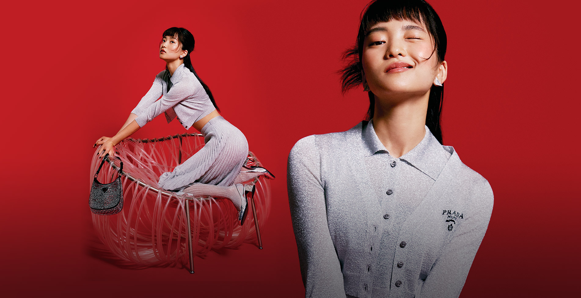 메탈릭 소재의 카디건과 크롭트 톱, 크리스털 장식의 스커트는 모두 Prada.