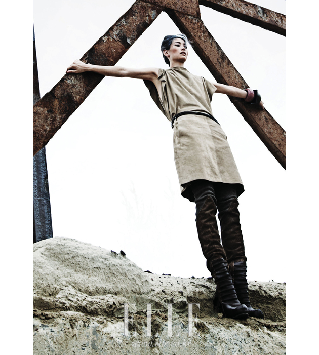 | 스웨이드 튜닉 드레스, 태슬 장식의 블랙과 카키 컬러 벨트, 레이어드한 뱅글은 모두 가격 미정, Herme′s. 스웨이드 소재의 사이하이 부츠는 가격 미정, Rick Owens. |