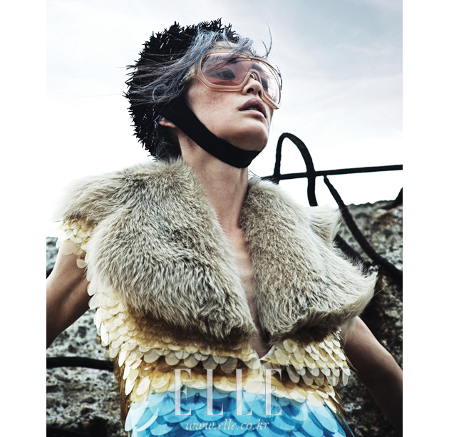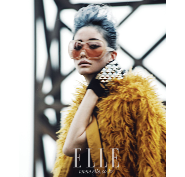 | 벌키한 머스터드 컬러 퍼 후드 점퍼는 가격 미정, Bottega Veneta. 커다란 고글형의 선글라스는 가격 미정, Prada. 스터드 장식이 화려한 글러브는 가격 미정, Bell & Nouveau. |
