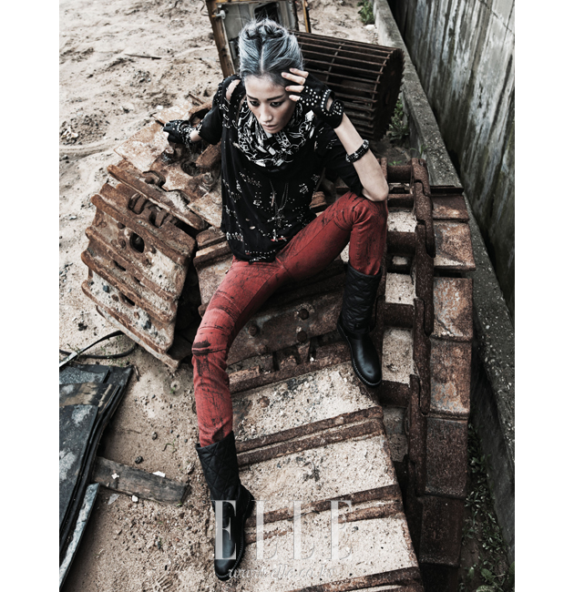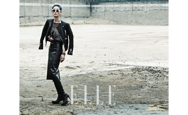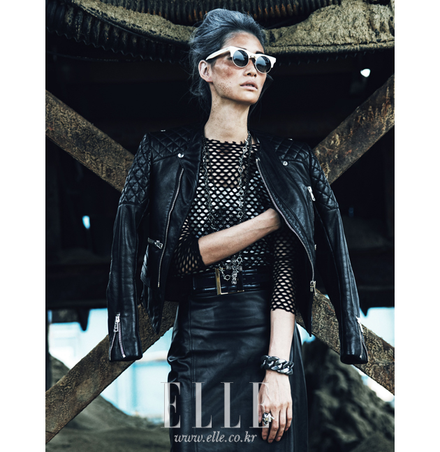 | 블랙 메시 톱 안에 입은 해골 스터드 장식 슬리브리스는 48만원, Roen by Je Ne Sais Quoi. 메시 톱은 4만3천원, Woodry. 레더 스커트는 가격 미정, Ralph Lauren. 레더 재킷은 가격 미정, Balenciaga. 사이하이 부츠는 1백만원대, Burberry. 팔찌는 가격 미정, Natalia Brilli by Boon the Shop. 링은 가격 미정, Alexander McQueen by Boon the Shop. 선글라스는 24만9천원, ALO x JUUN.J. |