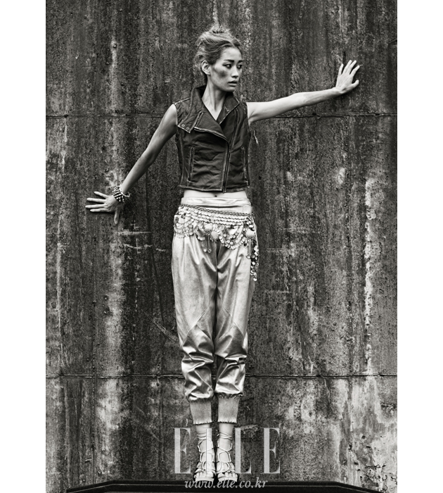 | 벽에 긁힌 듯, 자연스러운 워싱이 매력적인 빈티지 무드의 레더 베스트는 가격 미정, Donna Karan. 골드 팬츠는 가격 미정, Herme′s, 골드 밧줄 모양 스트랩 샌들은 가격 미정, DVF. 허리에 감아 연출한 참 장식 네크리스는 가격 미정, Bell & Nouveau. 골드 스터드 뱅글은 가격 미정, Aurelie Bidermann by Celebration. 실버와 골드로 된 체인 브레이슬릿은 20만9천원, JooMi Lim by Published. |