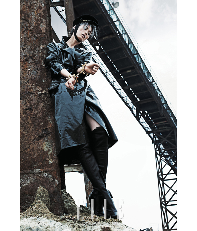 | 라텍스 소재 페이턴트 코트와 코르셋 벨트, 양손에 찬 수갑 모양의 팔찌, 장교 유니폼 스타일의 모자는 모두 가격 미정, Louis Vuitton. 블랙 사이하이 부츠는 1백만원대, Burberry. |