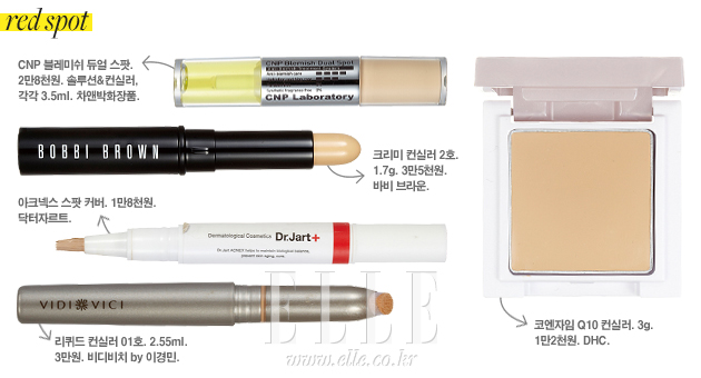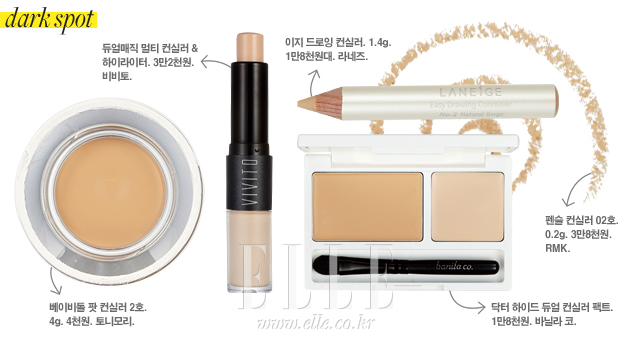 커버력이 우수한 크림이나 스틱 타입, 화이트닝 성분이 함유된 기능성 컨실러가 적당하다. 다크 스폿을 제대로 커버하기 위해선 파운데이션을 얇게 펴 바른 상태에서 전체 피부 톤보다 약간 어둡고, 잡티보다는 약간 밝은 색상의 컨실러로 색소침착 부위를 먼저 커버해주는 것이 좋다. 그런 다음 한 톤 밝은 리퀴드 컨실러로 주변의 넓은 부위를 커버한 후 얼룩져 보이지 않도록 블렌딩하고 밀착력이 강한 파우더 팩트로 마무리하면 완벽하다. |