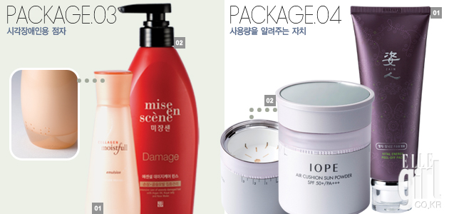 사용양을 알려주는 장치 때때로 화장품을 얼만큼 덜어 써야하는지, 제품이 얼만큼 남았는지 궁금할 때가 있다. 이런 불편함을 없애기 위해 아이오페는 패키지 바깥에 눈금자를, 코리아나 화장품은 패키지의 뒷면에 1회 사용량 그림으로 그려넣었다. 또 미키모토 코스메틱은 특수 스티커를 부착해 남아있는 양을 알 수 있도록 하고 있다.