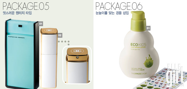 눈높이에 맞는 경품 삽입 더페이스샵의 에코키즈 라인은 귀여운 완두콩 캐릭터 ‘콩콩이’를 그려넣고 제품에 이름을 새길 수 있도록 알파벳 스티커를 증정함으로써 아이들에게 친근감을 주려는 아이디어가 돋보인 사례. 또 메이크업에 관심이 많은 20대 여성을 위해 마스카라 제품 안에 샘플용 마스카라 리무버를 동봉하거나, 스킨케어에 관심이 많은 40대 여성을 위한 고기능 에센스 제품 속에 미니 사이즈 토너와 크림을 함께 넣는 것 역시 여기에 해당된다.