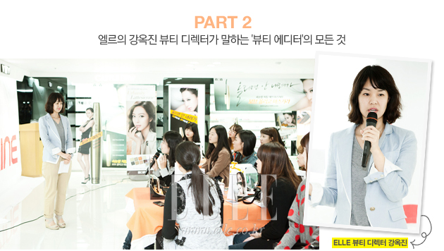 | 드디어 지니 에디터들이 고대한 엘르 강옥진 뷰티 디렉터의 특별한 강연이 시작됐다. 이날 강연의 주제는 바로 그녀가 어느 누구보다 자신 있게 이야기 할 수 있는 ‘뷰티 에디터’란 직업에 관한 모든 것. 평소 뷰티 에디터에 관심이 많은 지니 에디터들은 똘망똘망한 눈빛으로 그녀의 강연에 경청했다. 그녀는 정보 수집, 기획, 콘티 구성, 촬영 등 뷰티 에디터가 하는 일에 대해 구체적으로 설명하고, 이어서 트렌드를 한발 앞서 접할 수 있다는 점과 여성으로서 뷰티에 대한 모든 것을 즐길 수 있다는 에디터의 매력적인 장점을 이야기했다. 마지막으로 뷰티 에디터가 되고 싶은 지니 에디터들을 위해 어시스턴트를 거쳐 공채에 입사하는 것이 가장 일반적인 방법이라고 조언하며 그에 따른 꾸준한 노력도 필요하다는 현실적인 충고도 잊지 않았다. |