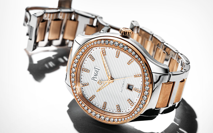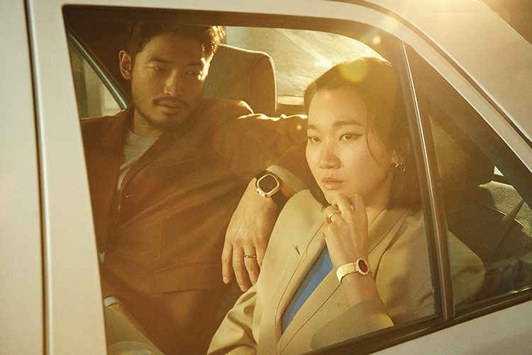 블루 다이얼과 크로노그래프 기능이 돋보이는 18K 스틸 소재 ‘폴로 워치’, 74개의 브릴리언트 컷 다이아몬드가 세팅된 ‘포제션 링’과 화이트 골드만으로 디자인된 심플한 ‘포제션 웨딩링’은 모두 Piaget. 의상은 모두 Gucci.