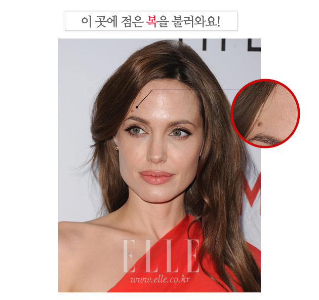 '오른쪽 눈썹 위'에 점은 성공점 안젤리나 졸리의 오른쪽 눈썹 위에는 메이크업으로도 가릴 수 없는 눈에 띄는 점이 있다. 이 점은 어떤 난관에 부딪혀도 좌절하지 않고 헤쳐나갈 수 있는 굳은 의지를 엿볼 있는 복점이라고 한다. 또한, 항상 주변에 자신을 돕는 사람들이 있어 ‘황금인맥’을 자랑하는 성공한 이들에게서 나타나는 점이라고 하니, 한 분야에서 두각을 나타내고 있는 이가 있다면 그의 얼굴을 살펴보자. 아마도 오른쪽 눈썹 위에 ‘성공점’이 있을지도 모른다.