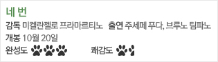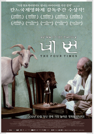 고양이 기지개: 작년 칸 영화제의 진정한 발견이다. <네 번>이라는 제목이 다소 황당할 수도 있다. 사실 <포 타임즈>라는 영문 제목이 '순환'의 의미를 지닌다는 점에서 이 영화의 의미를 더 잘 드러낸다. 어떤 특정 횟수보다는 과거로부터 현재와 미래로 이어지는 '무한한 것'의 의미를 표현할 수 있기 때문이다. 영화의 전반부는 노인의 느슨한 일상을 보여주지만, 노인이 세상을 떠난 후에는 아기 염소, 전나무와 숯의 이야기가 꼬리에 꼬리를 물고 펼쳐진다. 운명의 사슬을 이어가는 이야기는 다큐멘터리처럼 진행된다. 자연스럽게 극 영화와 다큐의 경계를 허물고 있다.
