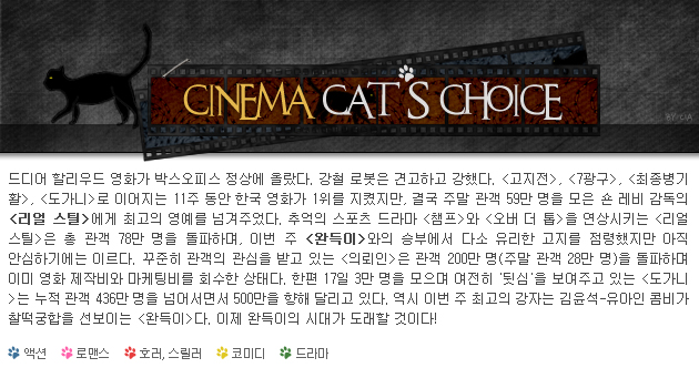 고양이 기지개: 올해 최고의 영화 예고편은 단연 <완득이>다! "얌마, 도완득!"을 반복해 외치는 김윤석만 봐도 구미가 확 당기니 말이다. 막상 뚜껑을 열면 더욱 놀라운 영화다. <선생 김봉두>, <여선생 VS 여제자>와 비슷한 영화(학원 코미디?)로 예상하기 쉽지만, 10대의 다양한 고민거리를 모두 건드리는 영화다. 담임 동주와의 귀여운 애증 관계나 옆집 아저씨(김상호)의 욕지거리로 실컷 웃기다가, 다이나믹한 킥복싱과 눈물 흘리게 만드는 출생의 비밀까지 첨가하니, 완득이표 섞어찌개가 완성된다. 이 정도의 맛이라면, 최고의 청춘 영화가 태어났다고 소문내도 괜찮다.