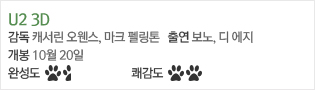 고양이 기지개: 유의 사항 하나! 이번 완성도나 쾌감도는 결코 'U2'의 음악에 관한 평가가 아니다. 그들의 음악을 함부로 평가하는 건 범죄행위나 다름없다. 일단 2007년에 3D로 제작된 음악 콘서트이니 3D의 향연을 기대해선 안 된다. U2 멤버들이 움직이지 않을 때 찍었다고 생각하면 된다. 또한 음악 영화가 아니라 스크린으로 즐기는 콘서트이니 마틴 스콜세지의 <샤인 어 라이트>와 비교하면 곤란하다. 그럼에도 이 콘서트를 극장에서 봐야 하는 이유는 오직 하나다. 그들이 'U2'이기 때문이다. 전설적인 1987년 앨범 '조슈아 트리'의 명곡을 듣는데 왜 망설임이 필요하나?