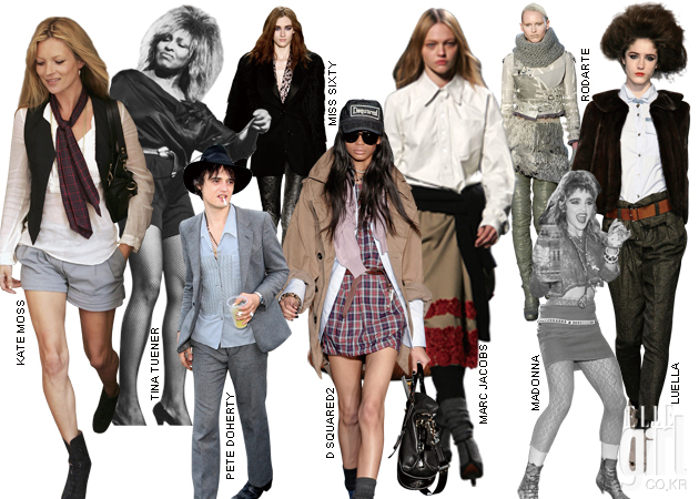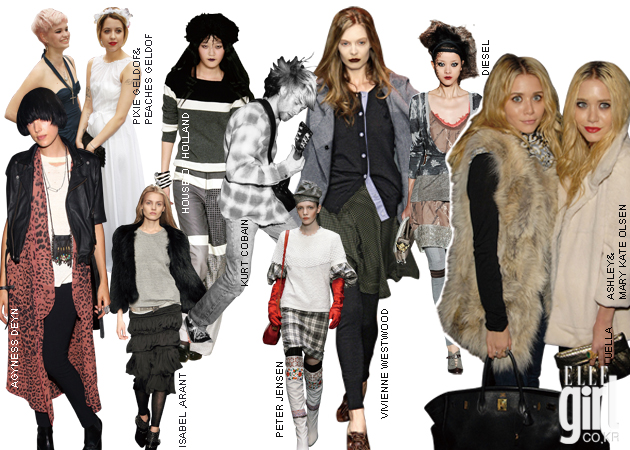 runway on grunge 이번 시즌 컬렉션을 앞두고 디자이너들은 긴장감을 늦추고, 좀더 느슨해지기로 마음을 먹었다. 그리고 런던 거리로 나가 영스터들의 펑크한 그런지 룩을 마스터하고, 1980년대 자유를 노래한 그런지 음악을 추억하며 컬렉션을 풀어냈다. 커트 코베인의 그런지 스피릿에서 영감받은 찰스 아나스타샤 컬렉션엔 비비안 웨스트우드가 연상되는 펑크와 아메리카 캐주얼이 한데 뒤섞여 걸리시한 룩킹이 선보였다. 프레피 무드의 체크 셔츠와 그레이 모직 팬츠를 입고, 여기에 어울리지 않을 것 같은 짧은 모피 재킷을 걸쳤으며, 화이트 코튼 셔츠엔 롱 카디건을 입고 그 위에 라이더 베스트를 레이어드 한 다음 워싱이 독특한 데님 팬츠를 매치했다. 게다가 다양한 패브릭을 이어붙인 듯한 패치워크 드레스와 거친 텍스처의 흡사 포대 자루 같은 실루엣의 드레스 등 1980년대 그런지 교과서에 충실한 룩이 등장하기도 했다. 다이안 본 퍼스텐버그의 보헤미안 룩은 형식이나 소재의 제한없이 다양한 레이어링을 통해 재현되었다. 볼드한 블랙 터틀넥 니트 스웨터와 현란한 프린트 레깅스, 오버사이즈 코트의 조합이나 실크 블라우스와 레이스 스커트, 레오파드 프린트 레깅스, 여기에 밍크 코트나 남자 것 같은 박시한 밀리터리 점퍼를 입어 변화무쌍한 레이어링의 공식을 보여준 것. 디스퀘어드의 딘&댄 형제를 통해 선보인 그런지에선 1980년대 사회의 부조리에 대항하는 반항적 보호들은 찾아볼 수 없지만 대신 요즘 영스터들이 열광하는 스트리트 룩을 완벽히 재현해냈다. 한손엔 스타벅스 벤티 사이즈 라테를, 다른 한손엔 블랙 베리를 들고 제스처를 취한 모델들은 티셔츠와 스쿨룩 파스텔 셔츠, 보이 프렌드 진과 넉넉하게 물이 빠진 가죽 재킷 그리고 트럭 운전사 모자의 조합으로 하이 & 로 스타일링의 진수를 보여줬다. 이번 시즌 런웨이에 등장한 그런지 룩은 획일화된 스타일링에 대한 디자이너들의 반기쯤으로 볼 수 있다. 정교한 쿠튀리에 터치나 최고급 소재로만으론 반드시 최고의 옷이 완성될 수 없다고 디자이너들은 한결같이 입을 모아 얘기한다. 넝마주의라는 비판을 듣던 그런지 룩이 패션 아카이브를 당당하게 장식할지 어느 누구도 상상할 수 없었던 것. 무엇보다 그런지 룩을 연출할 땐 어떻게 겹치고 조합하는지 등의 반짝이는 아이디어를 통해 기발한 룩킹이 나온다는 것을 명심하자.