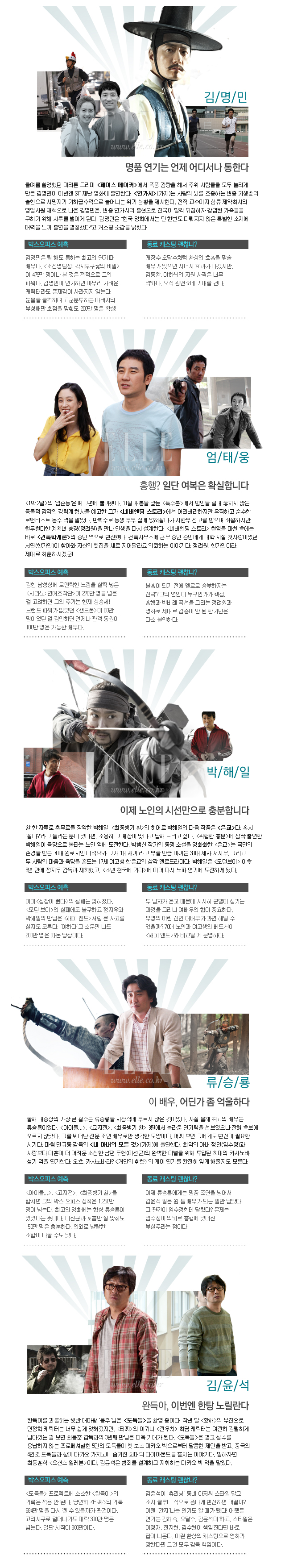 올해는 '조선명탐정'과 '최종병기 활'이 박스오피스에서 놀라운 기록을 세웠다. 각각 명탐정과 남이라는 불멸의 캐릭터가 탄생했다. 김명민과 박해일이라는 배우가 없었다면 불가능한 일이었다. 이런 최고의 캐스팅이야 말로 영화의 맛을 제대로 살려준다. 내년에는 어떤 캐릭터가 탄생할까? 한국 남자 배우들의 캐스팅 소식을 전한다.