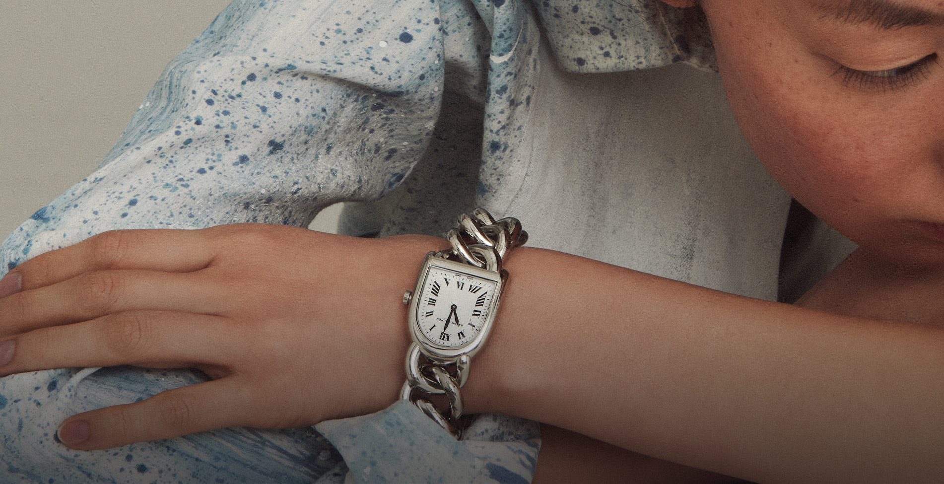 매끄럽게 폴리싱 처리한 스테인리스스틸 소재와 인터록 체인 브레이슬렛의 우아한 곡선이 조화를 이룬 ‘스몰 링크 스틸 스터럽 워치’는 Ralph Lauren Watch & Fine Jewelry. 셔츠는 Ralph Lauren Collection.