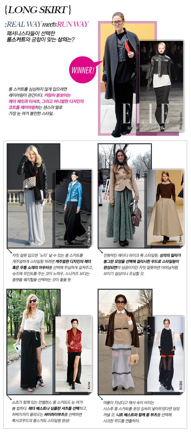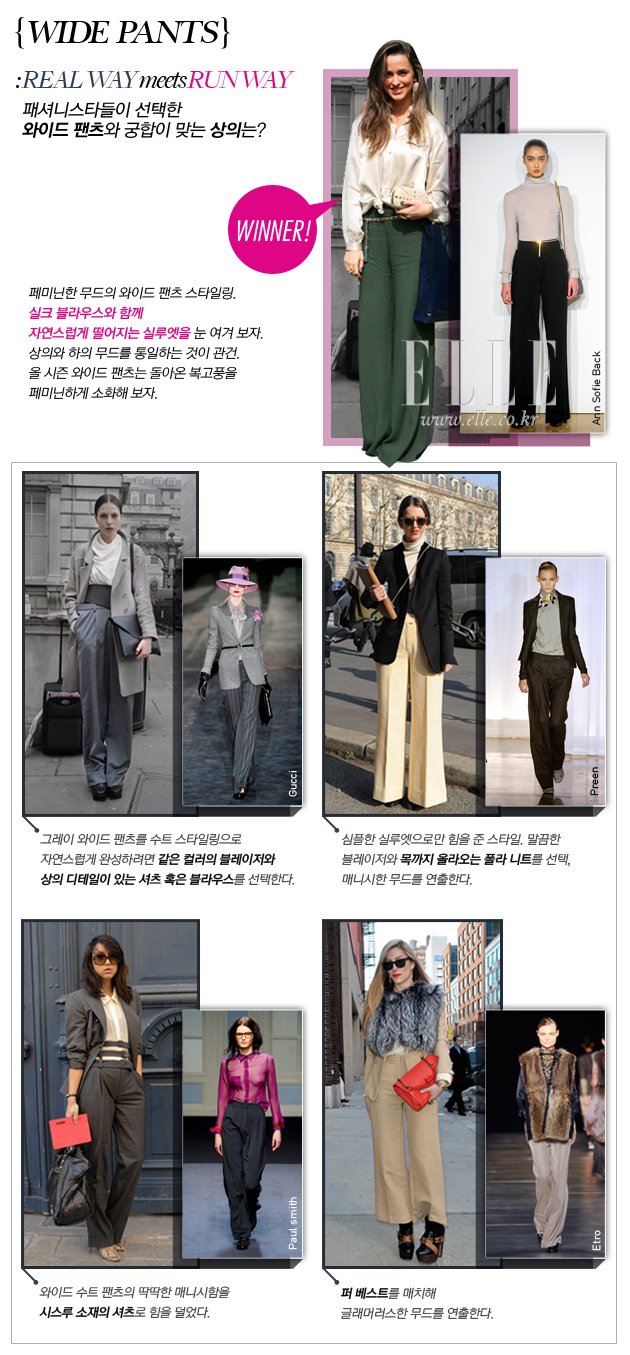 스키니 팬츠와 마이크로 미니 스커트의 시대에 안녕을 고한다. 1960년대의 물결을 타고 와이드 팬츠와 롱스커트의 바람이 일고 있다. 발 빠른 쇼퍼홀릭의 옷장을 이미 점령한 아이템은? 뉴욕, 밀라노, 파리, 런던 패셔니스타의 스타일에 주목해 보자!