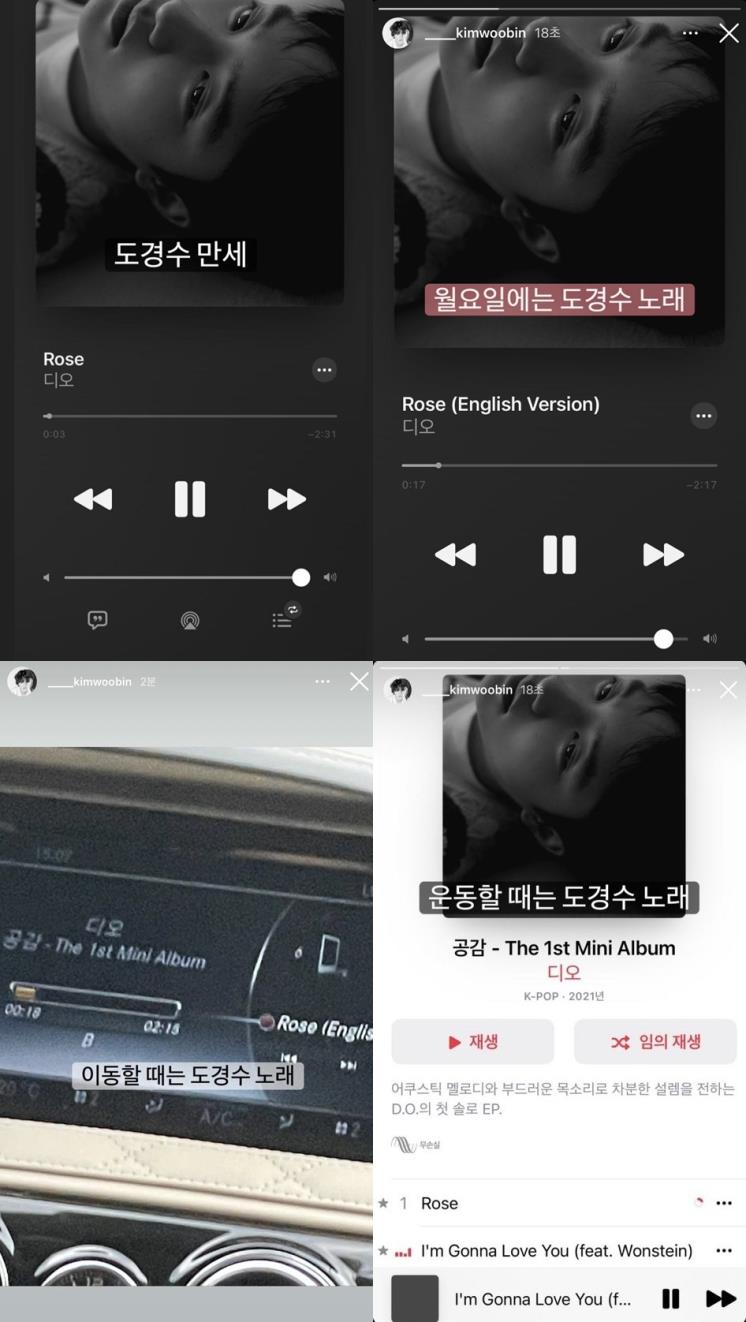 김우빈은 디오의 팬으로도 열심히 활동 중(?)입니다. 그는 인터뷰에서 가장 좋아하는 가수가 누구냐는 질문에 망설임 없이 "도경수"라고 대답했어요. 또한 디오의 '로즈(Rose)'라는 노래를 자주 듣는다며 "운동할 때 항상 도경수 노래로 시작하고 마무리 스트레칭을 할 때도 듣는다"라고 찐 팬의 면모를 드러냈습니다.