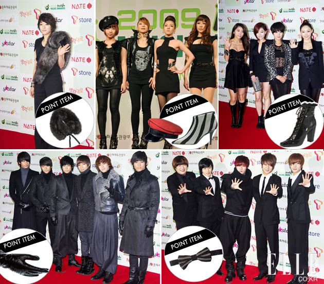 2 ‘올해의 신인상’을 수상한 2NE1은 실험적인 노출 패션으로 눈길을 끌었다. 박봄과 산다라는 허리와 어깨를 노출한 블랙 미니 원피스로 L과 공민지는 파워숄더 재킷으로 스타일링해 섹시한 매력을 강조했다. 본인들만큼이나 개성 강한 슈즈와 공민지의 해군모자가 레드카펫룩의 포인트 아이템 *일명 해군 모자. 로에베 *지브라 패턴의 송치 부티. 지미추