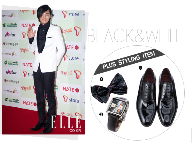 5 군더더기 없는 블랙 스타일로 등장한 슈퍼주니어. ‘우리는 슈퍼주니~어예요’를 무한반복 외치며 즐거워하던 그들의 센스는 어디까지일까. 슈퍼주니어의 포인트 아이템은 앙증맞은 보타이 *모노톤의 스트라이프 보타이. 폴 스미스 |