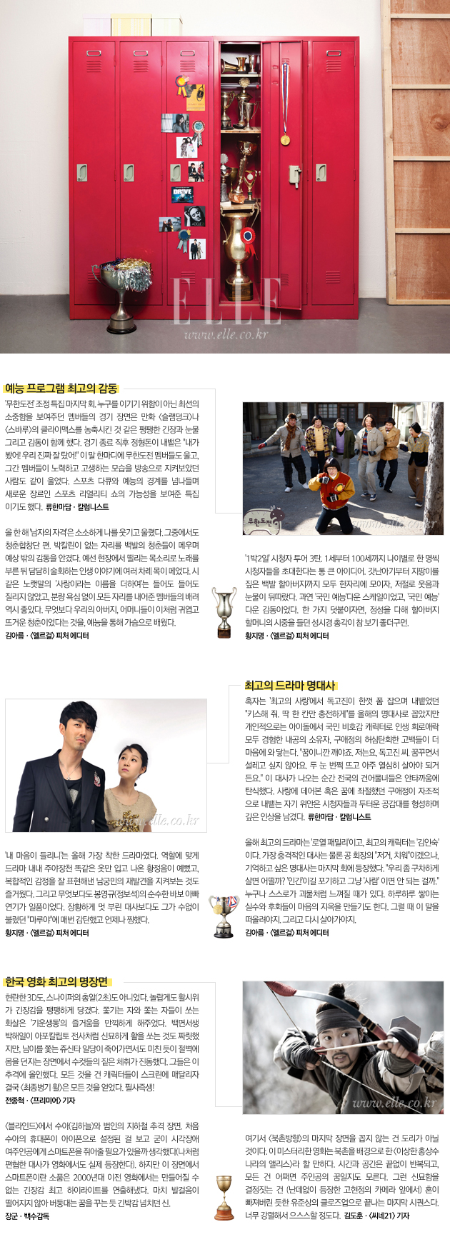2011년 엔터테인먼트 분야의 영광스러운 승자들을 호명한 <엘르걸> 어워드. 올해를 빛낸 예능, 드라마, 영화에서 최고의 순간을 뽑았다. 당신은 어떤 순간에 '무한' 감동을 하셨나요?