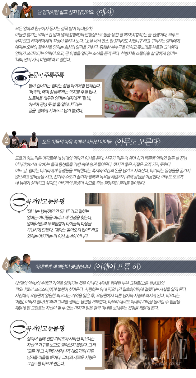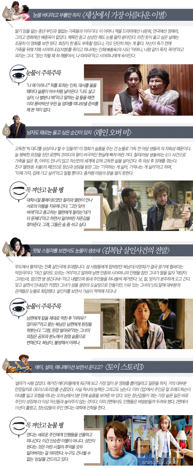 괜스레 쓸쓸해 지는 계절이다. 이한치한? 이럴 때는 오히려 눈물이 '주르륵' 흐르는 영화가 더 좋을 수도 있다. 언제든지 마음 편하게 울고 싶다면 이 영화들을 추천한다. 눈물샘을 자극하는 최고의 영화들이다. 영화지 전문기자와 매거진 에디터들에게 추천을 받았다. 그들의 뜨거운 눈물을 믿어도 좋다. 눈물은 언제나 솔직하니까.