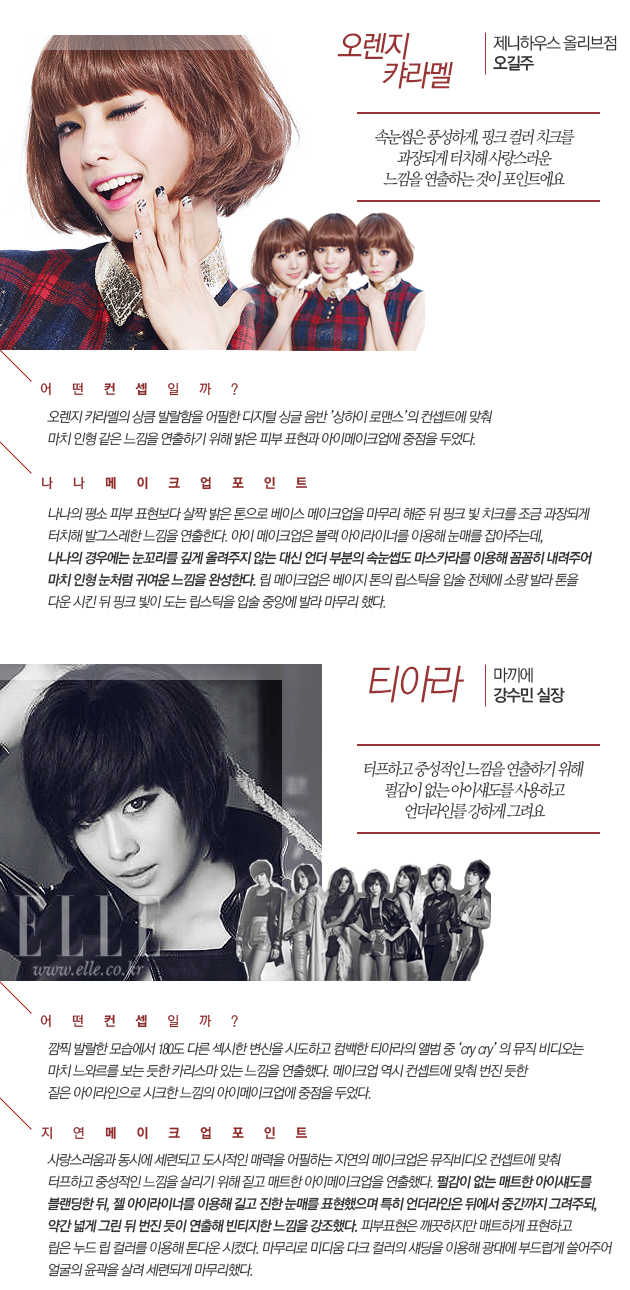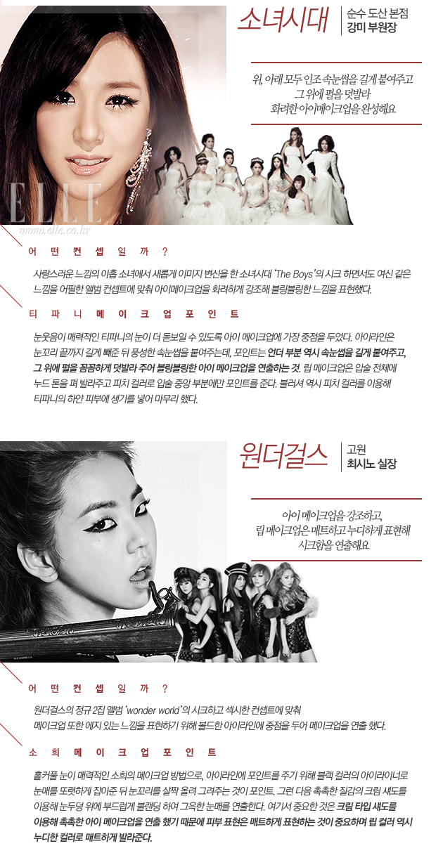 원더걸스의 매혹적인 스모키 메이크업부터 오렌지 캬라멜의 러블리한 메이크업 까지! TV 속 매력적인 걸 그룹의 메이크업 스킬이 궁금하다면 주목! 여기 걸 그룹 메이크업을 담당하고 있는 아티스트들이 그 비법을 아낌없이 공개한다.
