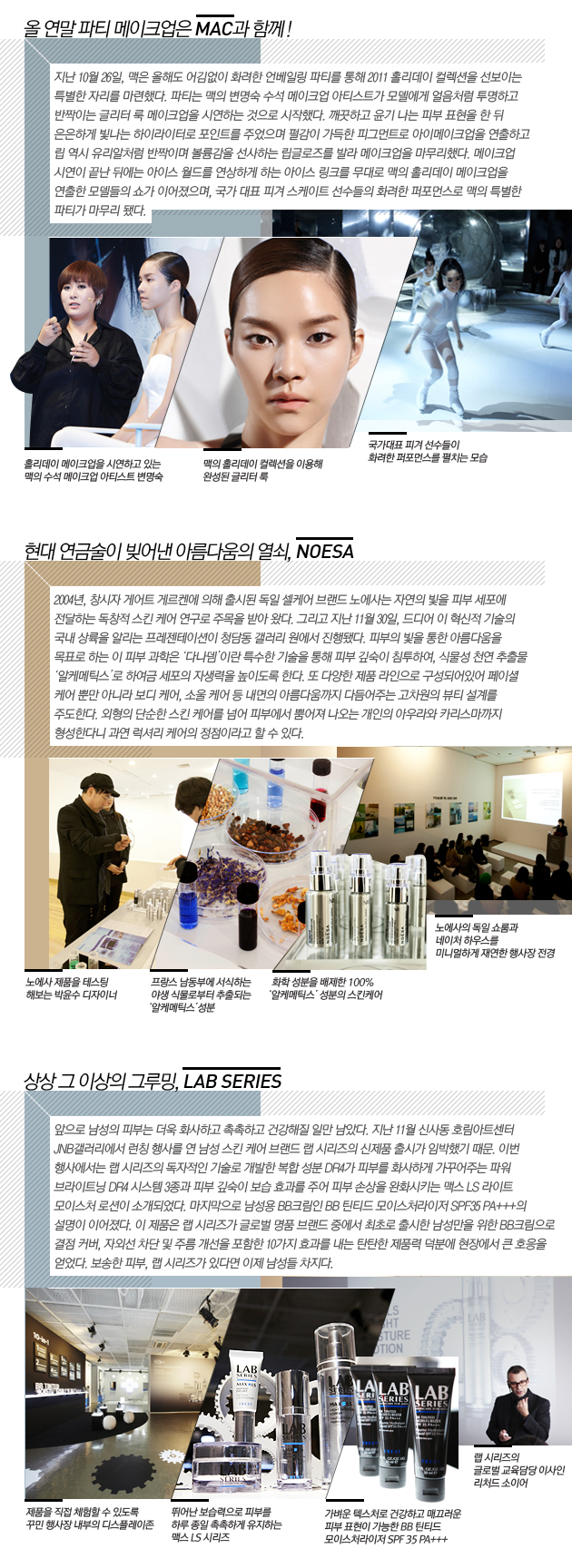 추운 겨울, 거칠고 생기를 잃은 당신의 피부를 업그레이드 시켜 줄 뷰티 브랜드들의 신제품 론칭 행사가 열렸다. 화려한 글리터 룩으로 당신을 파티의 여왕으로 만들어 줄 맥의 언베일링 파티, 비교할 수 없는 남성 스킨케어 브랜드 랩시리즈의 새로운 스킨케어 라인, 그리고 독일 셀케어 브랜드 노에사의 한국 론칭 소식을 소개한다.