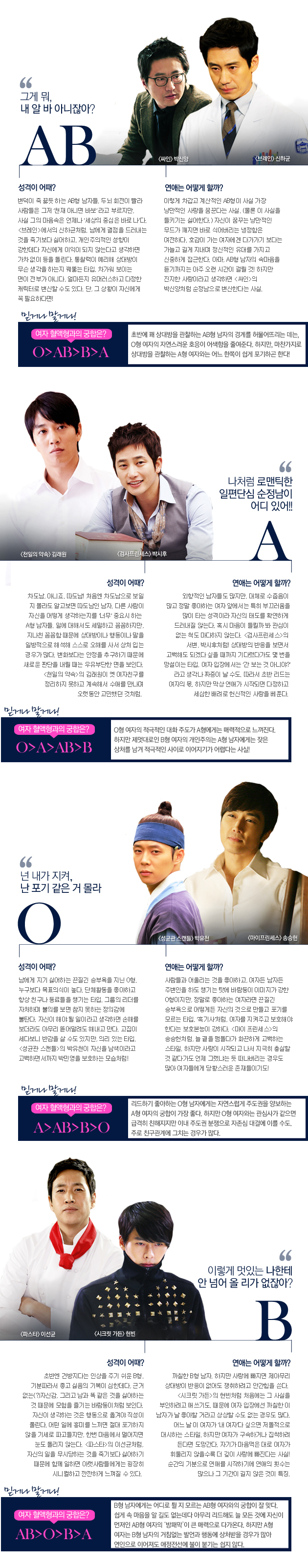 나와는 달라도 너무 다른 이 남자들. 드라마 속 왕자님일 뿐이지만, 사실 현실이 더 드라마틱한 법이 아니던가? 다시 한번 두고 보자. 믿거나 말거나인 혈액형이라지만, 어쩌면 이렇게도 가지런한 캐릭터들인지. 네 가지 타입으로 알아보는 드라마 속 남주 캐릭터들! 나와 궁합이 꼭 맞는 혈액형은 과연 누구?