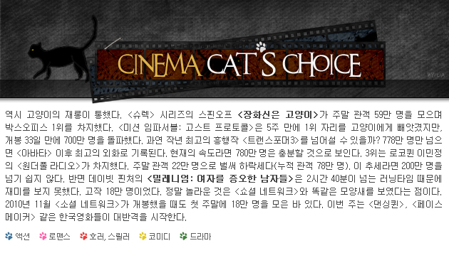 고양이 기지개: 노장 페이스 메이커의 올림픽 도전기. 포스터만 봐도 바로 느낌이 오는 것처럼, <국가대표>를 표방한 휴머니즘 영화다. 꼴지의 반란에는 언제나 감동과 눈물이 있지 않던가! 제2의 <국가대표>나 <말아톤>이 되고 싶겠지만, 그 정도의 감동이나 흥분을 보장하지는 않는다. 사실 이 영화를 골라야 한다면 이유는 하나다. 바로 김명민에 대한 믿음 때문! 김명민의 연기는 완벽이 아니라 '집착'이라고 부를 만큼 병적이다. 다이어트와 인공 치아를 통해 마라토너로 다시 태어났다. 자신을 송두리째 버리고 캐릭터의 삶을 사는 그의 도전정신은 정말 눈부시다.