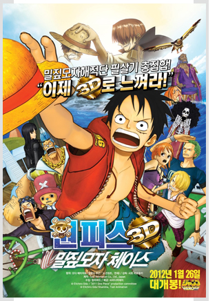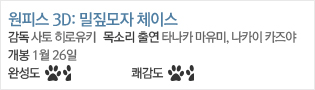 고양이 기지개: 포스터 제목처럼 <원피스>를 3D로 만들었다. <아따맘마> 극장판처럼 러닝타임은 고작 30분이다. 이전의 <원피스> 극장판에 비해서는 참 실망스럽다. 짧게나마 3D를 즐기는 특별판이다. 하지만 3D로 기자 시사를 하지 않은 관계로 그 위력을 전혀 알 수가 없다. 평점이 낮은 이유는 3D라는 '플러스 알파' 점수가 빠져서 그렇다. 물론 포인트는 예상 가능하다! 독수리가 날아오르는 거나 스파이더 맨의 거미줄처럼 움직이는 루피의 팔은 3D에 딱 적합한 시츄에이션이다. 게다가 써니호로 롤러코스터 같은 느낌을 주었다. '체이스'라는 단어가 '딱'이다.